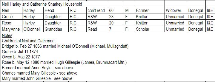 Finally, there are 7 Sharkey households, 6 Boyle households, 5 Harley, 4 Gillespie, 2 Duffy and 1 each of Healy and Houston with much intermarrying as well. The re-use of Christian names, which was an Irish as well as Scottish tradition, gives a clue as to the relationships between the households.